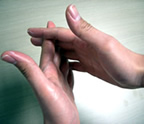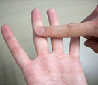 B次に、手足症候群の出やすい指先、関節、爪の間、手の平のしわの部分を丁寧に塗りこんでいきましょう。忘れずに両足にも塗りましょう。 |